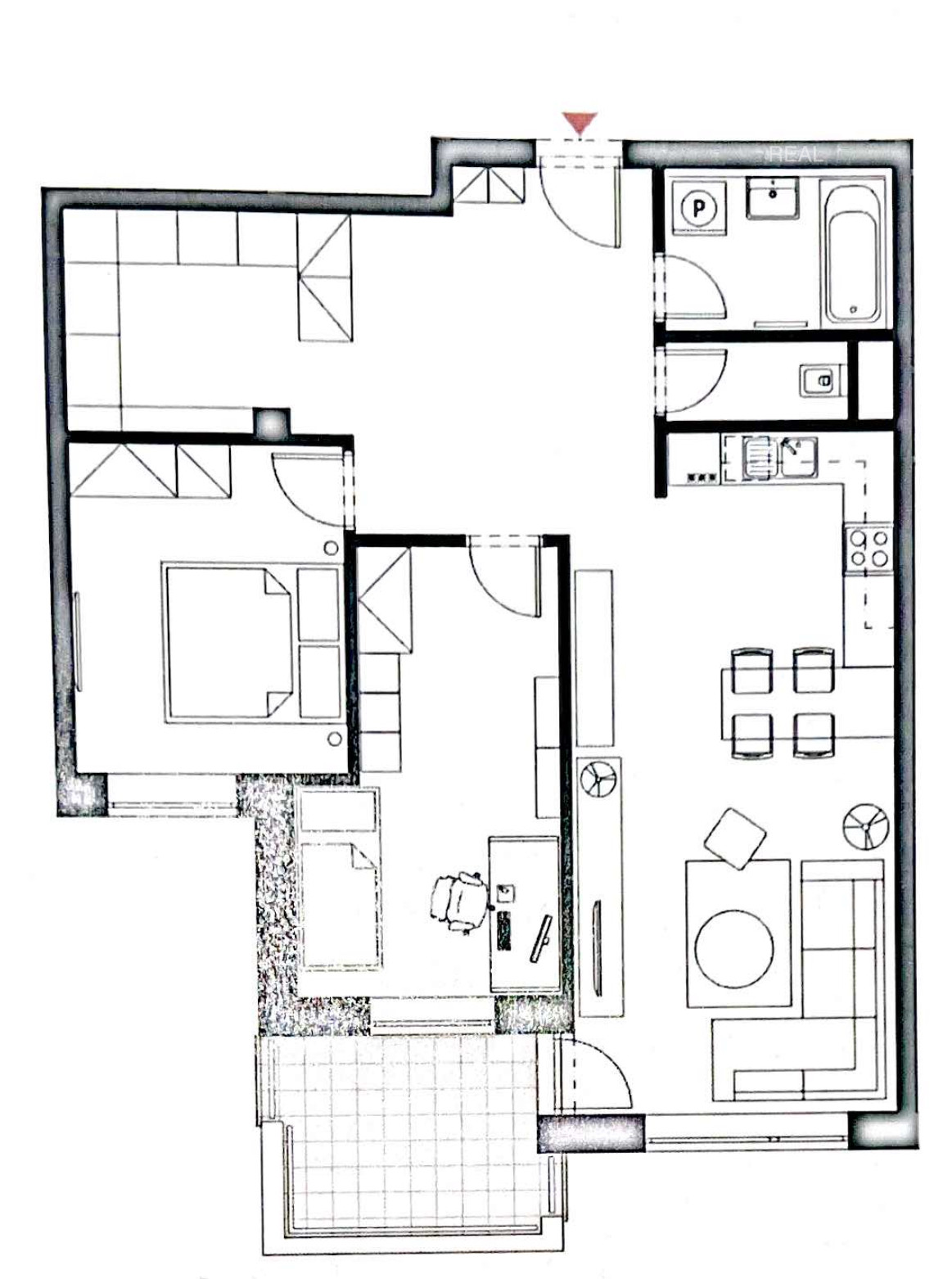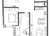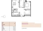 Byt disponuje veľkorysou centrálnou otvorenou vstupnou halou, z ktorej sa vchádza do kúpeľne, samostatnej toalety, obývacej izby s kuchyňou, do dvoch spální aj do veľkého walk in šatníka. Vstup na balkón je z obývacej izby.