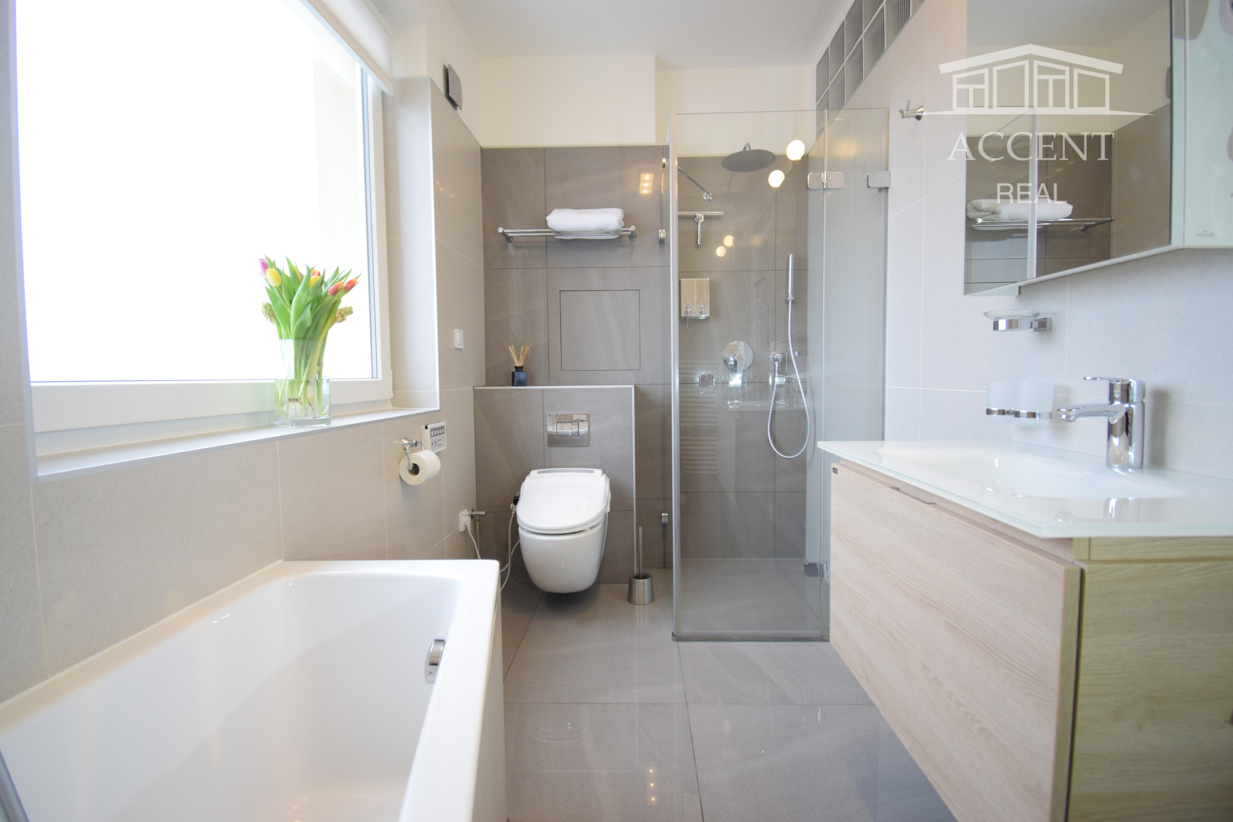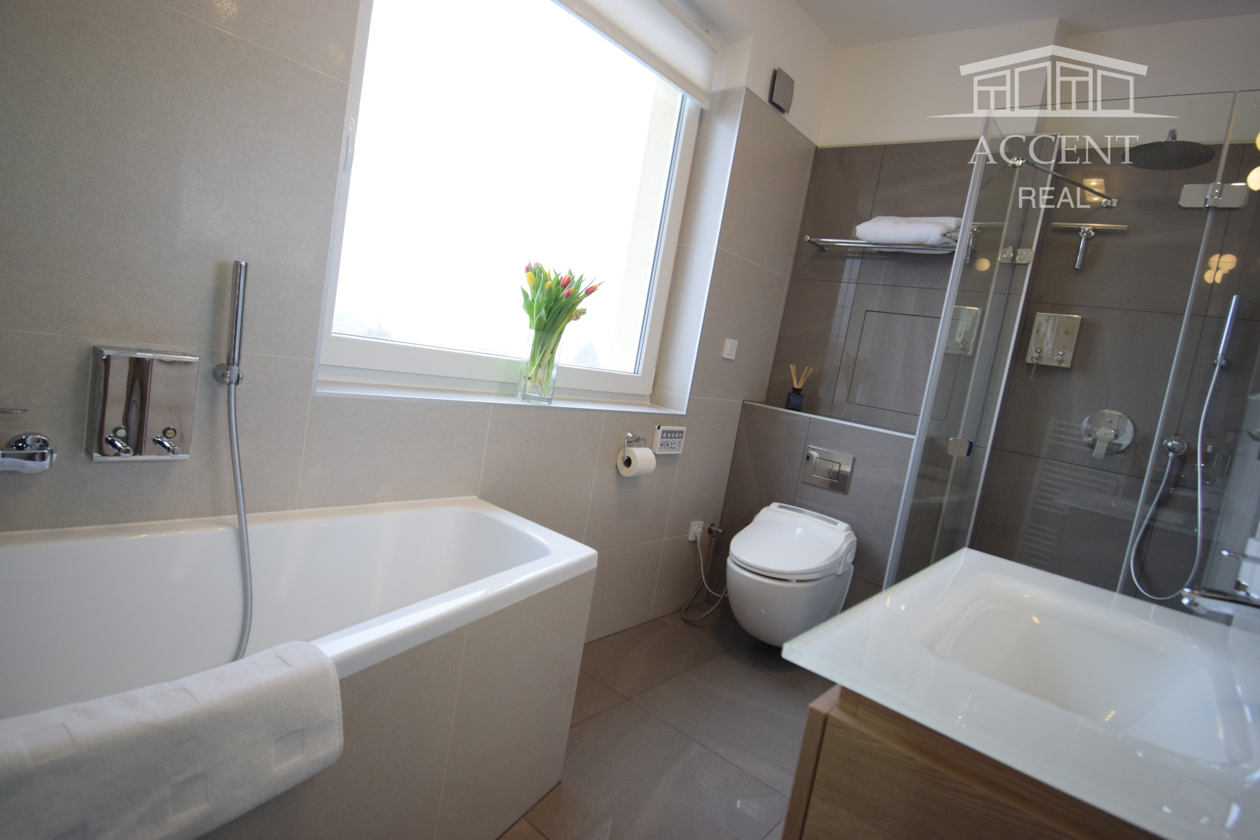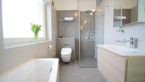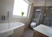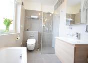 - kúpeľňa obložená gresovým obkladom na tenkú škáru, sprchový kút a vaňa