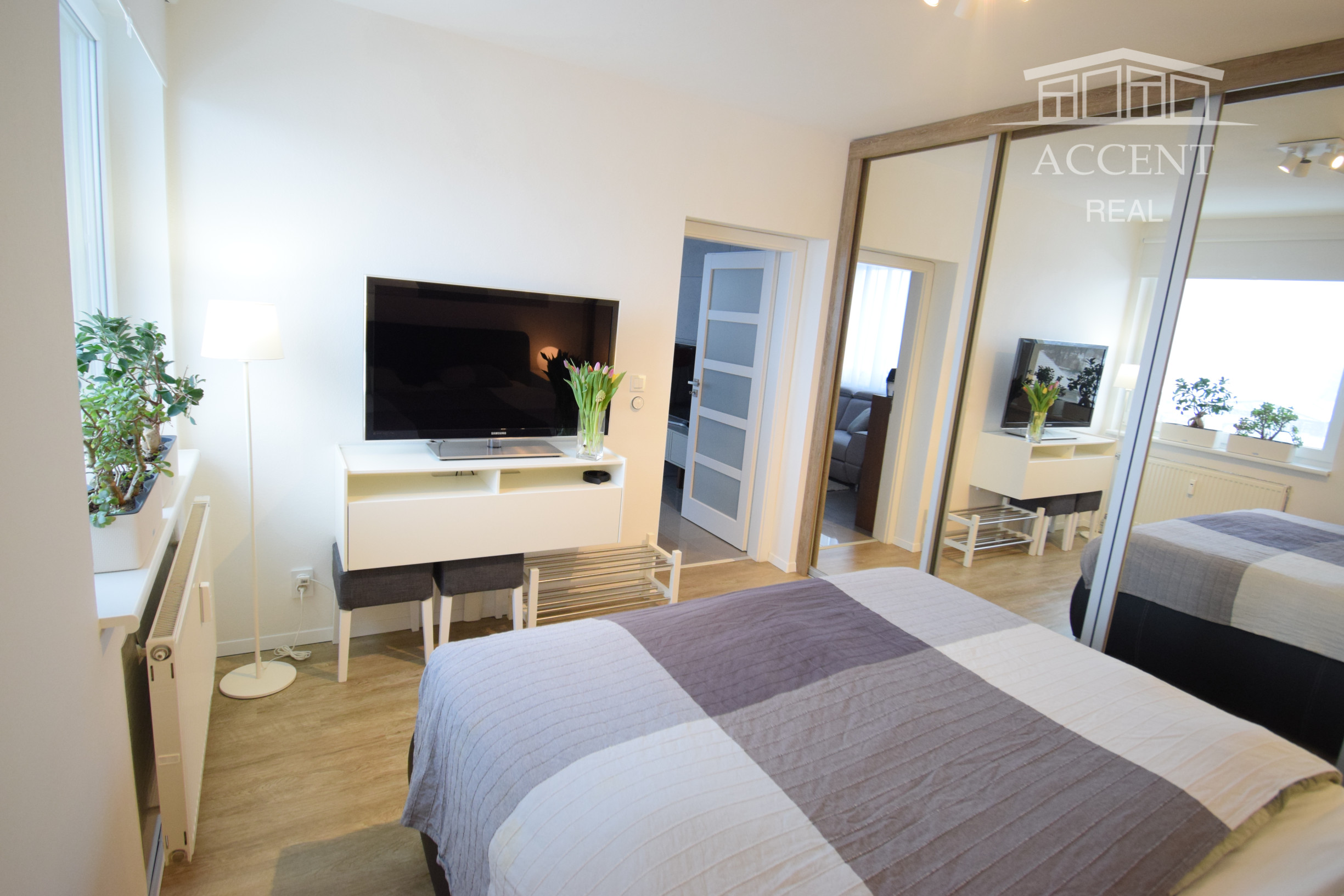 - v spálni veľká rolldor skriňa s manželskou postelou a televízorom
