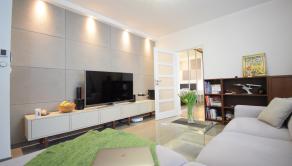 - v obývacej izbe kvalitný rozťahovací gauč v tvare L, konferenčný stolík a televízor
