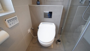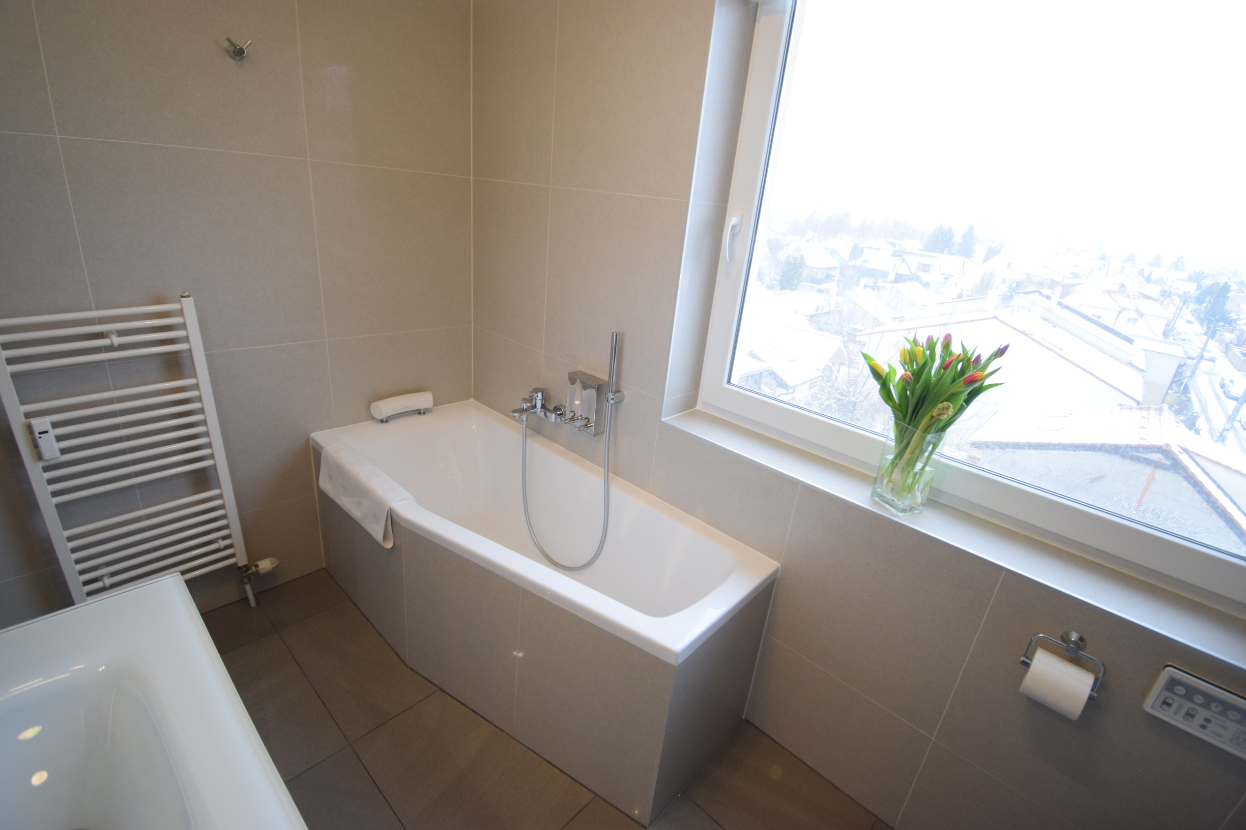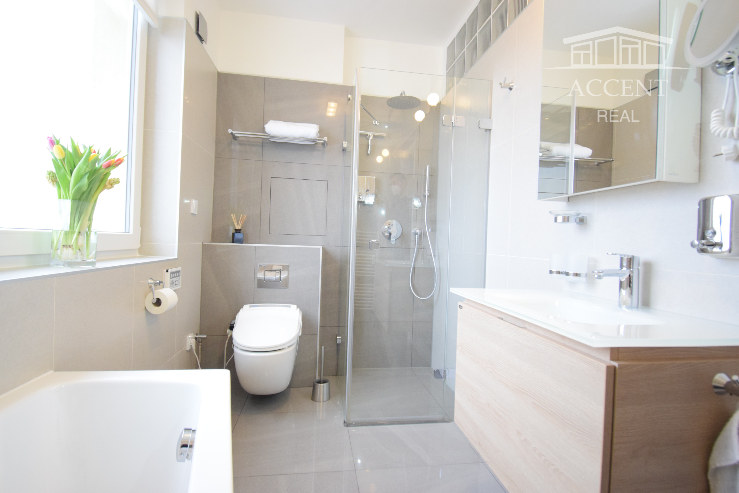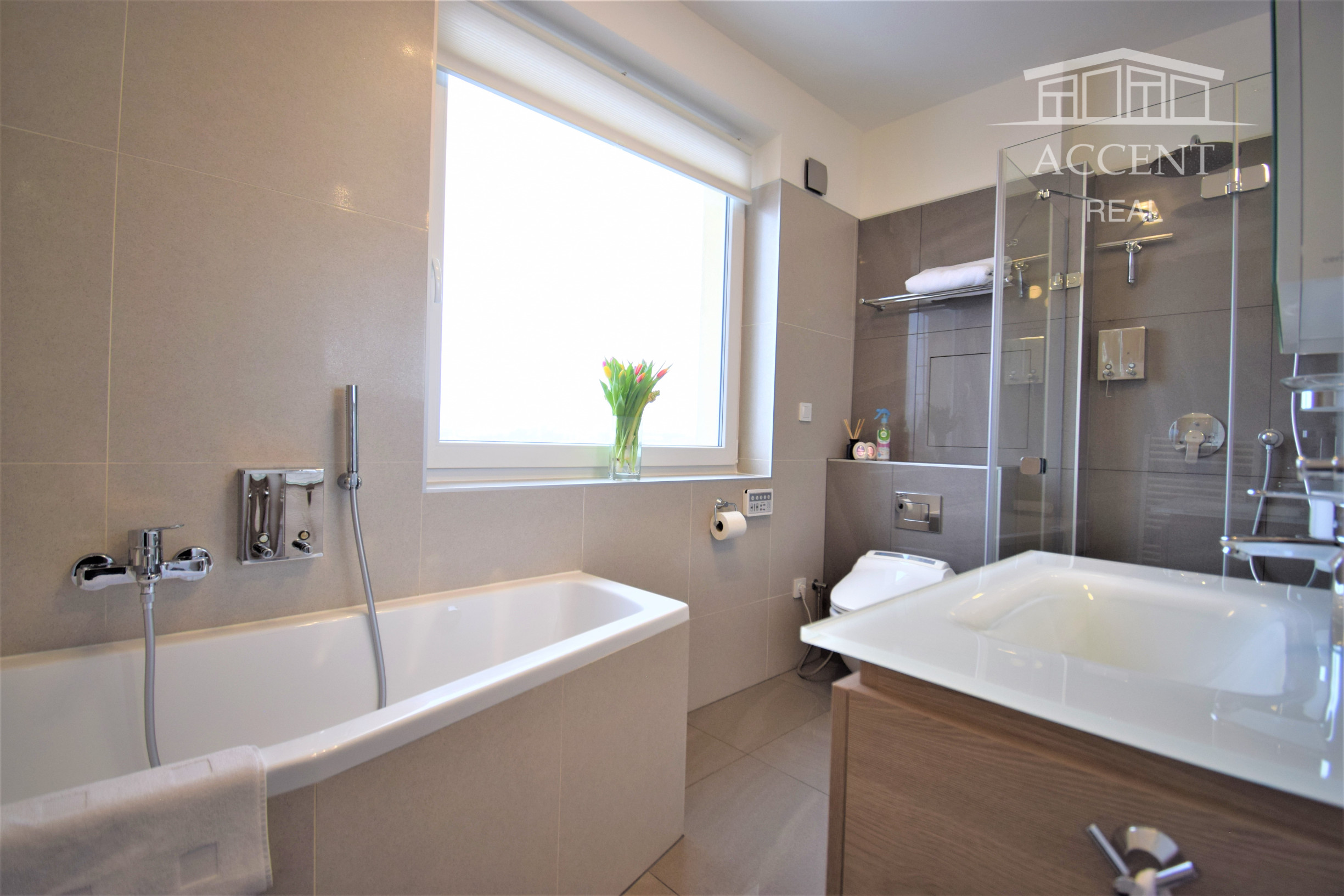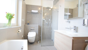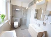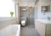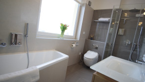 - kúpeľňa obložená gresovým obkladom na tenkú škáru, sprchový kút a vaňa