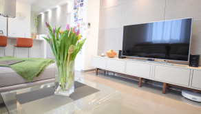- v obývacej izbe kvalitný rozťahovací gauč v tvare L, konferenčný stolík a televízor