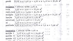 Prízemie: hala: 17,28m2, obývacia izba: 35,76m2, kuchyňa: 15,52m2, špajza: 2,76m2, schodisko: 15,84m2, WC: 1,9m2, práčovňa: 7,28m2