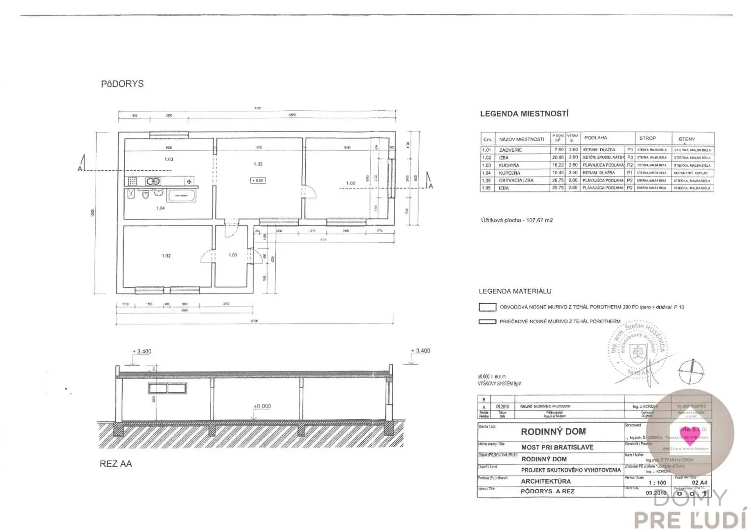 Výmery miestností: Predsieň 7,6 m2 • Izba: 20,9 m2 • Kuchyňa 16,22 m2 • Kúpeľňa 10,45 m2 • Obývacia izba: 26,75 m2 • Izba 25,75 m2, spolu úžitková plocha: 107, 67 m2 + 164m2 plocha pivnice